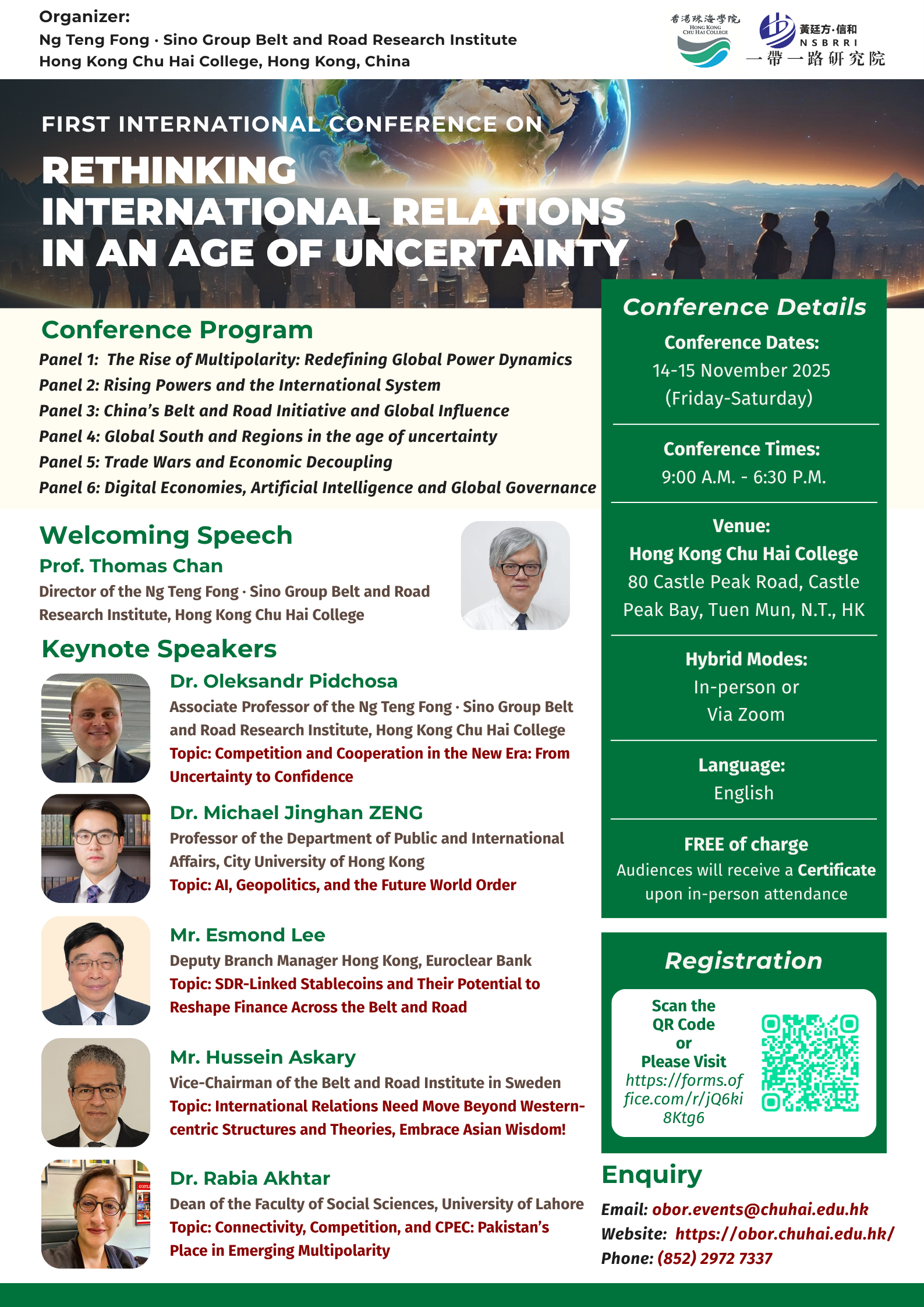 All students and staff are cordially invited by Prof. Thomas Chan to attend the First International Conference on "Rethinking International Relations in an Age of Uncertainty" hosted by the Ng Teng Fong.Sino Group Belt and Road Research Institute.