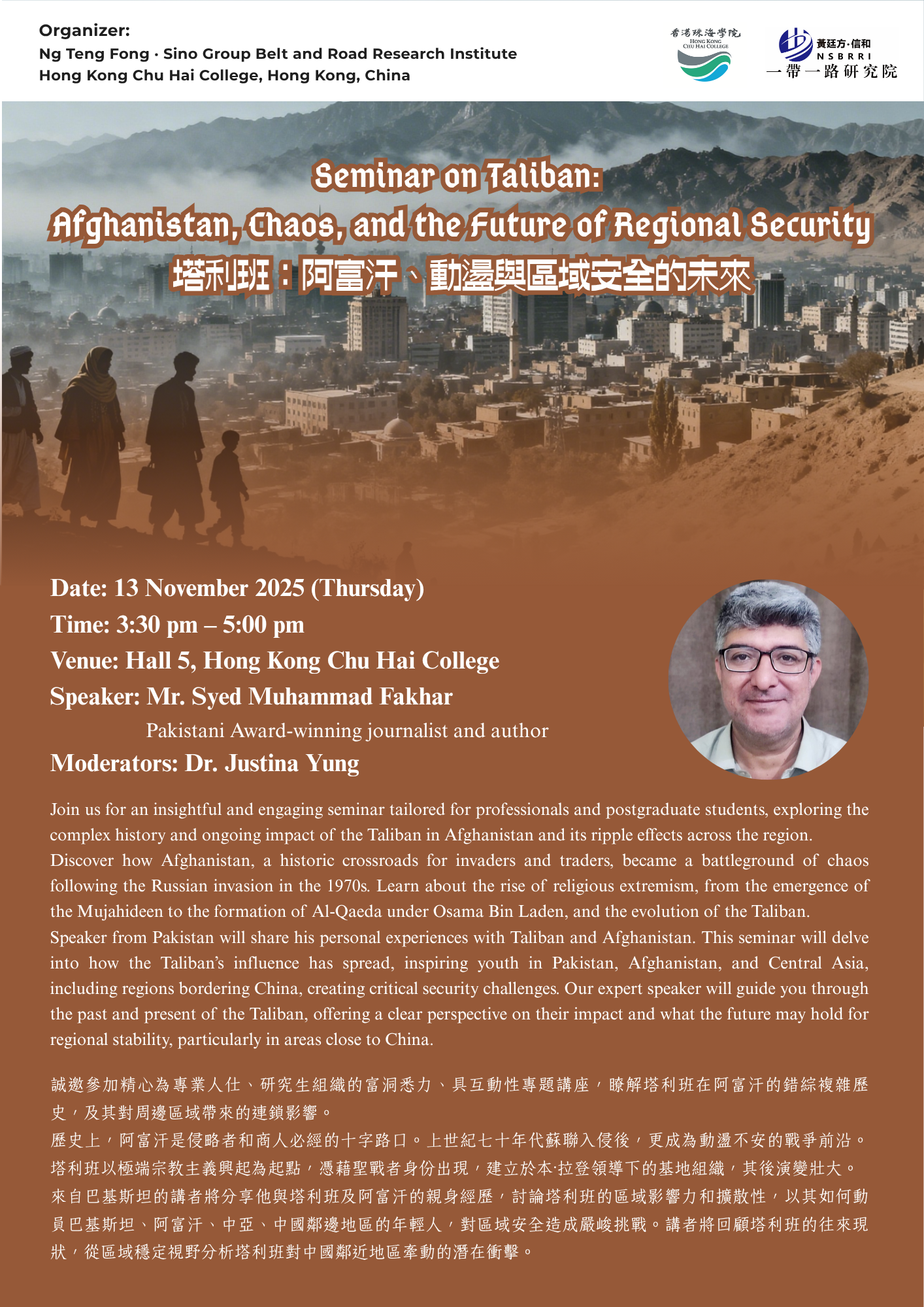 All students and staff are cordially invited by Prof. Thomas Chan to attend a seminar on "Taliban: Afghanistan, Chaos, and the Future of Regional Security" hosted by the Ng Teng Fong.Sino Group Belt and Road Research Institute.