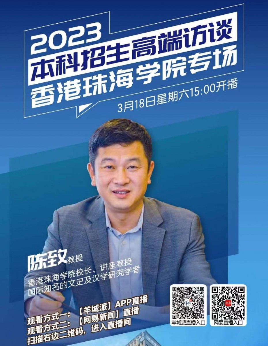 由廣州市招考辦指導,羊城晚報社主辦,羊城晚報教育發展研究院承辦的「2023廣東高招線上諮詢會——香港珠海學院專場」 於3月18日在線上舉行。香港珠海學院校長陳致教授,學校文學與社會科學院、商學院、理工學院的代表,以及學生代表出席諮詢會,為廣大考生提供學校申請最新權威資訊。本次諮詢會在羊城晚報新聞客戶端羊城派和網易新聞直播間同步推出,累計觀看突破百萬人次。