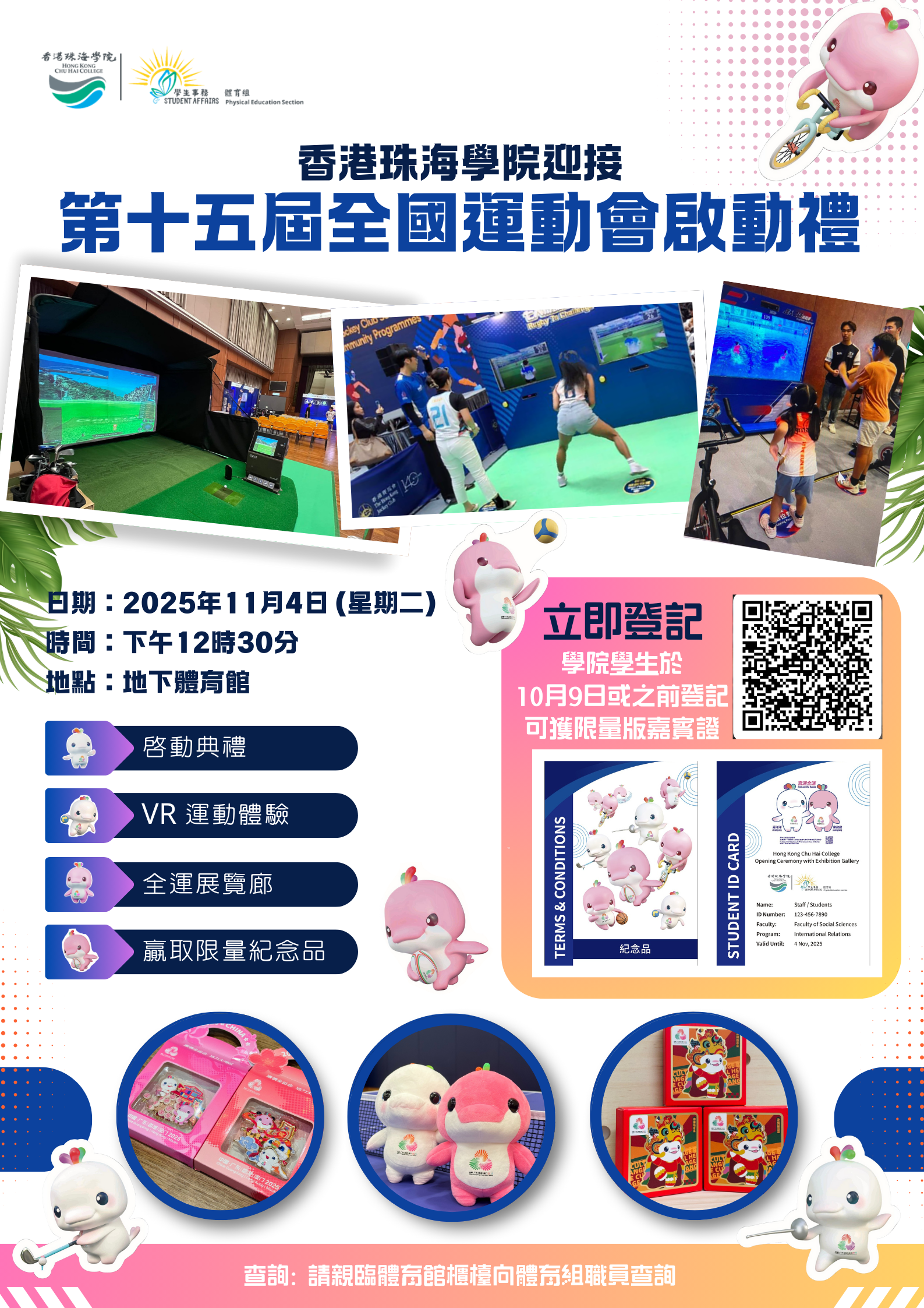 为庆祝并响应推广第十五届全运会首次由香港联同广东和澳门联合主办,本校将于2025年11月4日 (星期二) 举行香港珠海学院迎接第十五届全国运动会启动礼,现场设有多项精彩丰富活动,让本校师生关注此项体育盛事,一同投入体育狂热并分享喜悦。