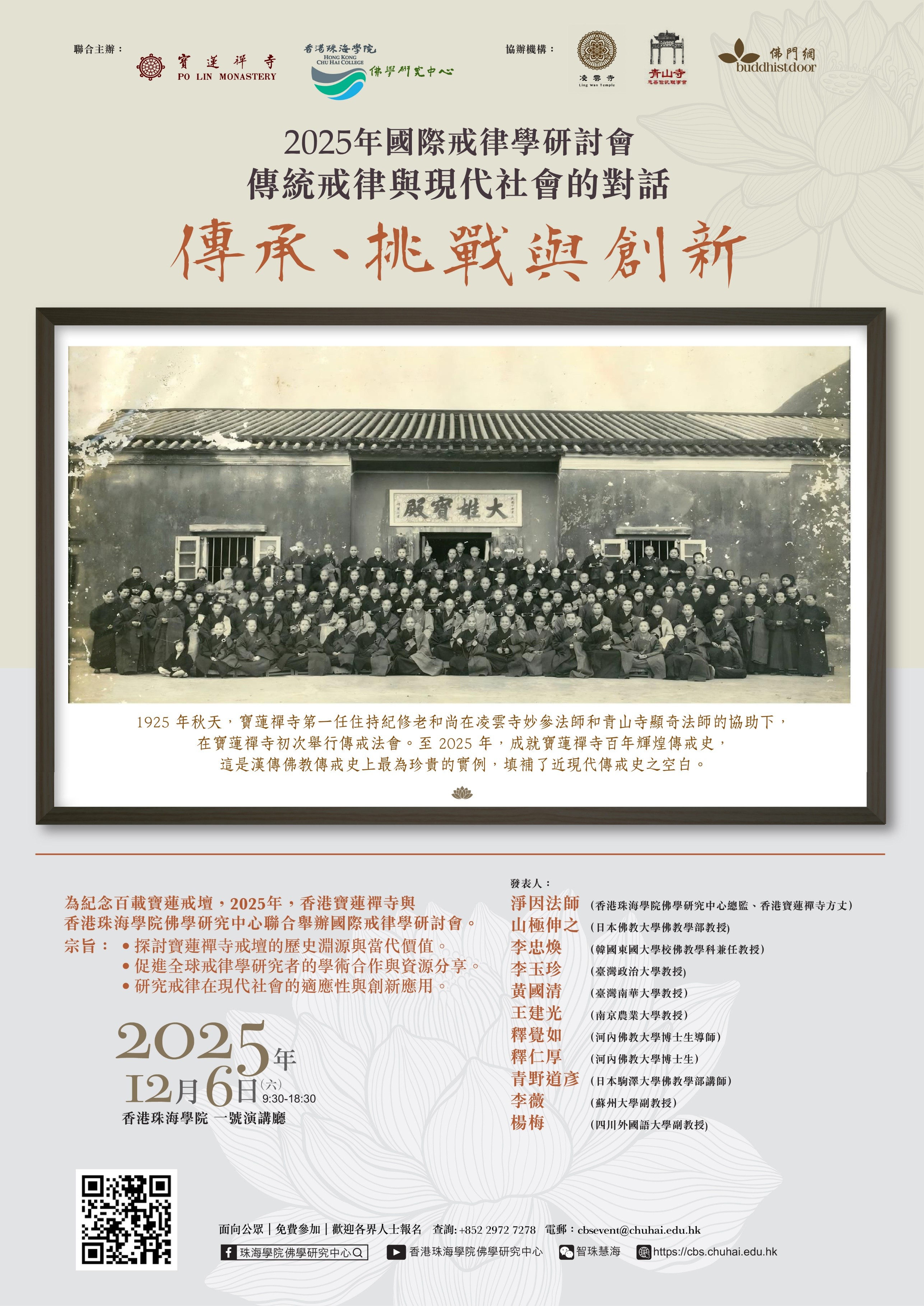 为纪念百载宝莲戒坛,香港宝莲禅寺与香港珠海学院佛学研究中心联合主办,凌云寺、青山寺、佛门网共同协办“2025 年国际戒律学研讨会”,旨在探讨宝莲禅寺戒坛的历史渊源与当代价值、促进全球戒律学研究者的学术合作与资源分享、研究戒律在现代社会的适应性与创新应用,欢迎各界人士报名。